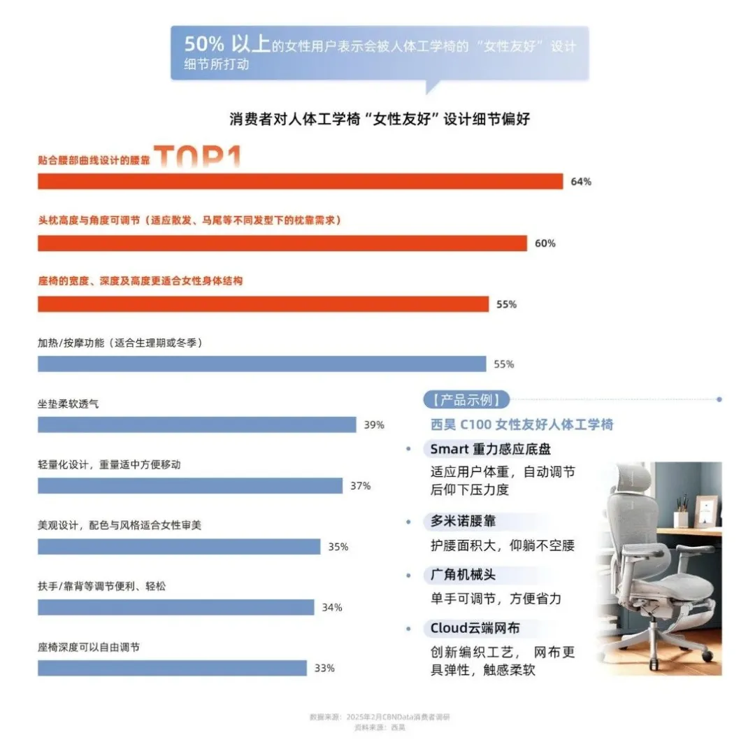 在诸多待满足需求中,女性消费者较男性消费者有更多诉求未被满足,且呈现出更强的支付意愿。65%的女性消费者迫切希望有满足更多细节需求的人体工学椅出现,50% 以上的女性用户表示会被人体工学椅的“女性友好”设计细节所打动。