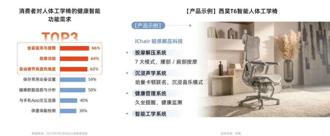 鉴于久坐带来的颈部疼痛、腰部不适、背部疼痛等问题,消费者对人体工学椅有着强烈的健康管理需求。坐姿监测与提醒、按摩功能与自动调节高度和角度占据了人们健康智能功能需求的前三位。西昊T6智能人体工学椅正是看到了消费者的智能健康管理需求,通过覆盖腰部/颈部的按摩解压系统、哈曼卡顿联名的沉浸声学系统、带有久坐提醒的健康管理系统及智能工学系统,为用户提供智能化的座椅健康管理方案。