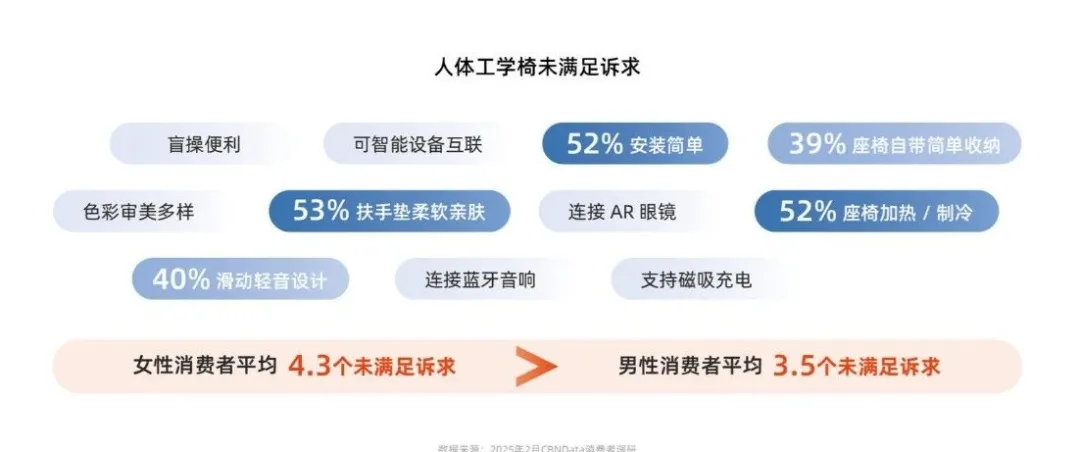 按摩、智能健康管理、健康疗愈等功能诉求,也反映了消费者对人体工学椅情绪价值附加功能的期待。与此同时,在附加功能偏好上,消费者需求也呈现出明显的性别差异:男性用户更关注智能化交互体验,而女性用户则更倾向于心理抚慰。