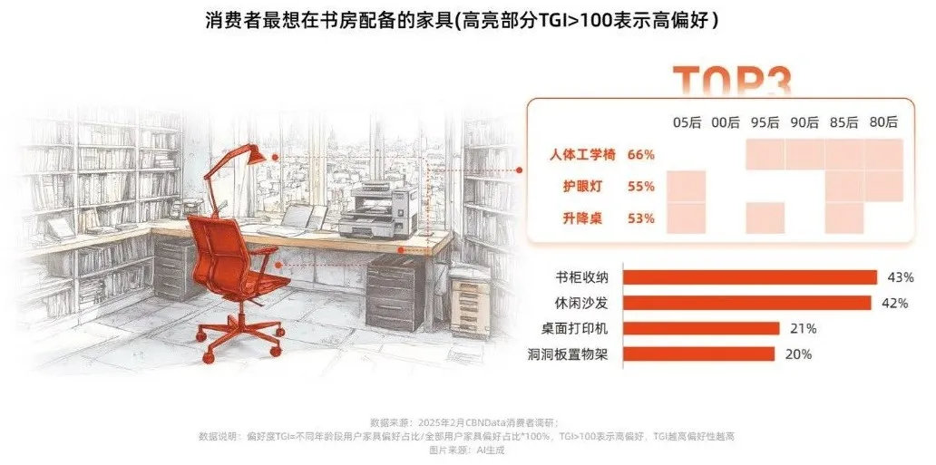 从“效率优先”到“舒适办公”,人们对学习、办公场景的需求升级,推动了新书房经济的火热。人体工学椅、护眼灯、升降桌也构成了当代人的书房“三大件”,其中人体工学椅线上市场在2024年实现43%的同比增速,成为“三大件”中增长最快的细分领域。