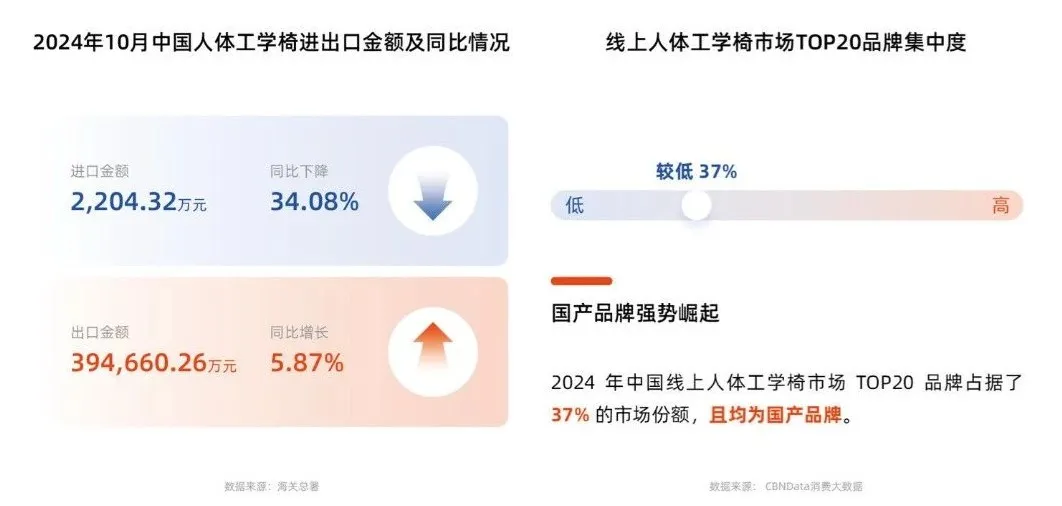 与此同时,人体工学椅线上消费的竞争格局也在悄然发生改变,国货强势崛起,进口金额同比缩水近四成,电商平台TOP20品牌皆为中国制造。