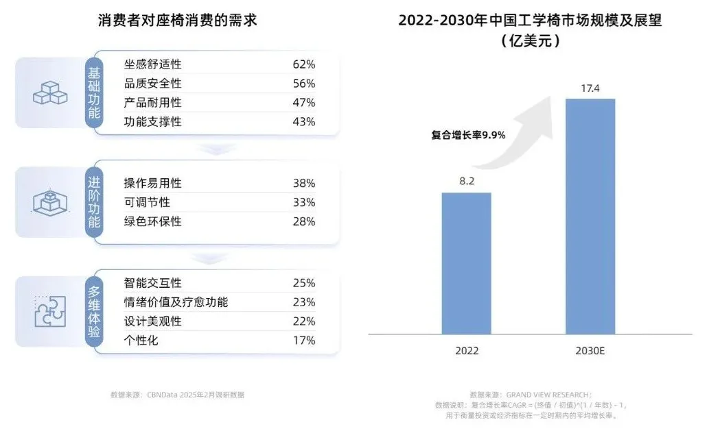 据第一财经商业数据中心(CBNData)调研显示,“久坐不累”与“睡的放松”、“情绪稳定”、“规律运动”一起成为了消费者眼中美好生活的关键词。满足消费者座椅体验的人体工学椅市场快速发展,2030年市场规模预计达17.4亿美元,复合增长率约为9.9%。