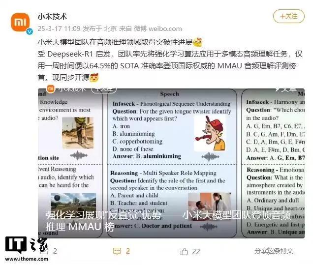 3月17日消息,@小米技术官微今日发文称,小米大模型团队在音频推理领域取得突破性进展。受DeepSeek-R1启发,团队率先将强化学习算法应用于多模态音频理解任务,仅用一周时间便以64.5%的SOTA准确率登顶国际权威的MMAU音频理解评测榜首,现同步开源。