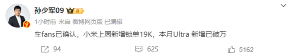 快科技3月17日消息,据博主“孙少军09”最新透露的数据显示,上周小米汽车单周锁单量超过了1.9万台,这是第二周连续维持在如此高位。