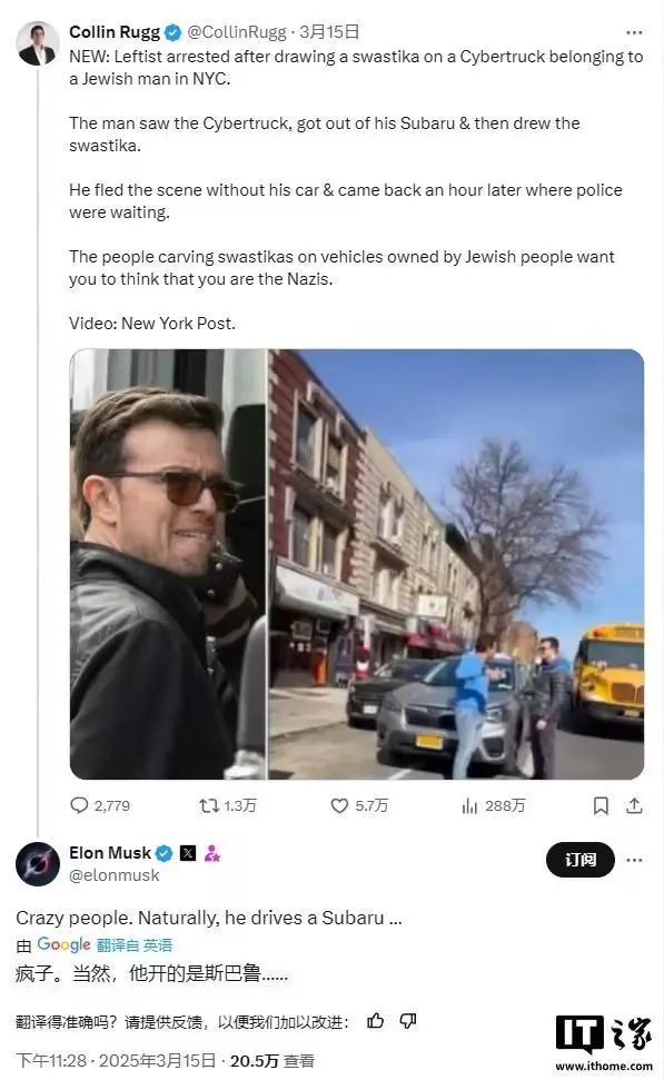 IT之家注意到,马斯克在看到视频后,对肇事者所驾驶的车辆品牌——斯巴鲁(Subaru)进行了调侃,他说道:“真是疯子。果不其然,他开的是斯巴鲁……”这一调侃或许源于一种刻板印象,即斯巴鲁车主通常具有强烈的政治和社会观点。在Reddit上,甚至有人调侃称斯巴鲁若不贴满至少十张贴纸便无法启动。