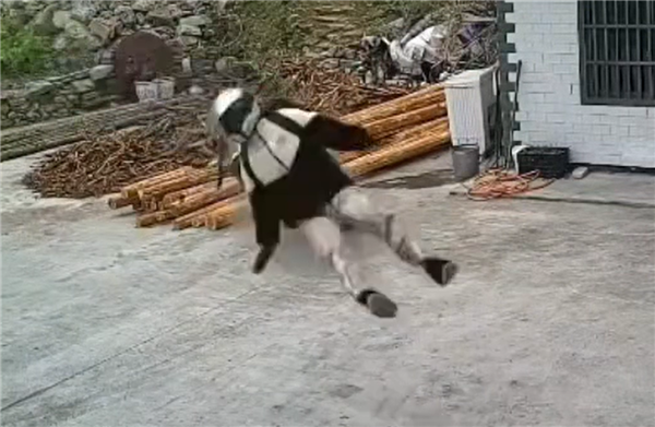 监控摄像头还拍下了非常滑稽的一幕,有网友形容他像是一只被丢在半空的企鹅,确实有几分贴切。