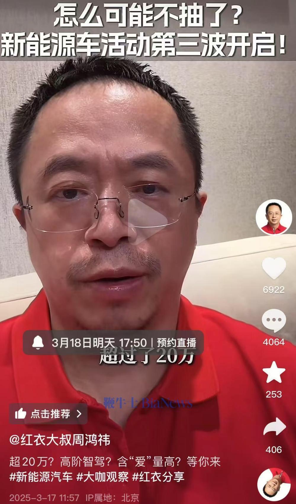 3月17日,周鸿祎在社交平台发布视频称,免费送100辆车的活动第三轮正式开启。