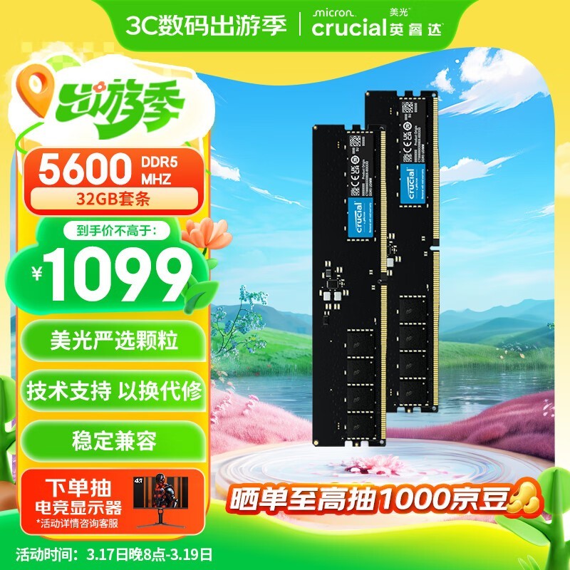 Crucial美光64GB DDR5 5600台式机内存条秒杀价