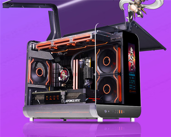 前侧面板左半边也为玻璃材质,右半边则配备了一块LCD屏幕,用户可在屏幕上定制自己想要显示的内容。机箱整体尺寸为435mm x 300mm×368mm,支持M-ATX/ITX主板。