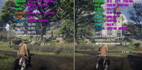 在《赛博朋克2077》测试中,酷睿Ultra7 265KF平台的平均帧速为107 FPS,最低瞬时帧速为67 FPS,功耗为107W,温度为53度;而Ryzen 7 9700X平台的平均帧速为103 FPS,最低瞬时帧速为65 FPS,功耗为115W,温度为65度。虽然两者在平均帧速方面相差不大,但酷睿Ultra7 265KF在功耗和温度方面表现更佳,为玩家提供了更加稳定和舒适的游戏环境,不用担心积热问题,进行长时间游戏也不用担心出现卡顿问题。