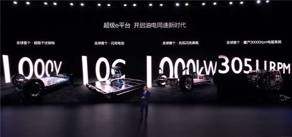 据悉,该平台由全球首个超级千伏架构、全球首个闪充电池、全球首个兆瓦闪充桩和全球首个量产30000转速电驱系统构成。