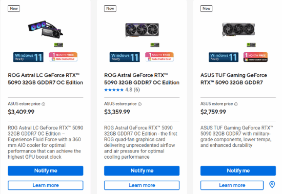 此外,TUF RTX 5090 OC 版也上调了价格,尽管涨幅相对较小(仅10美元),但其售价依然高达2999美元,约为MSRP的1.5倍。