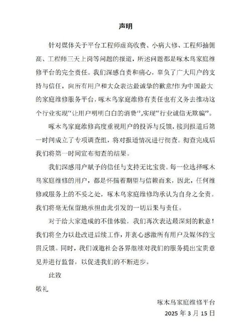 被曝光后,啄木鸟3月16日发布整改承诺书承认,在追求规模扩张的过程中,管理失控,导致收费不透明、培训误导、服务流程混乱等问题,被曝光的“培训套路收费”、“配件以次充好”等行为,严重损害了用户信任,也暴露了平台在管理机制上的严重漏洞。