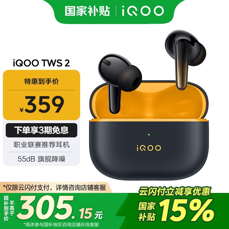iQOO TWS 2真无线降噪耳机幻影黄 Hi-Fi级音质 44ms低延迟