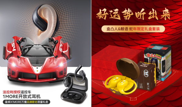 此外,活动还展出了万魔S70法拉利联名限量礼盒、京东定制款鲸语盒凸人蛇年限定盲盒、可口可乐T05无线蓝牙耳机,以及小马宝莉T08余晖烁烁礼盒装、辰风三丽鸥S05头戴式蓝牙耳机等跨界联名和IP产品,不仅融合了品牌文化与潮流元素,更凭借限量发售的稀缺属性,成为兼具使用价值与收藏意义的潮流好礼。