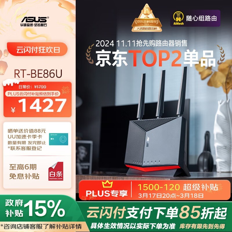 华硕RT - BE86U路由器京东热销,到手价1679元