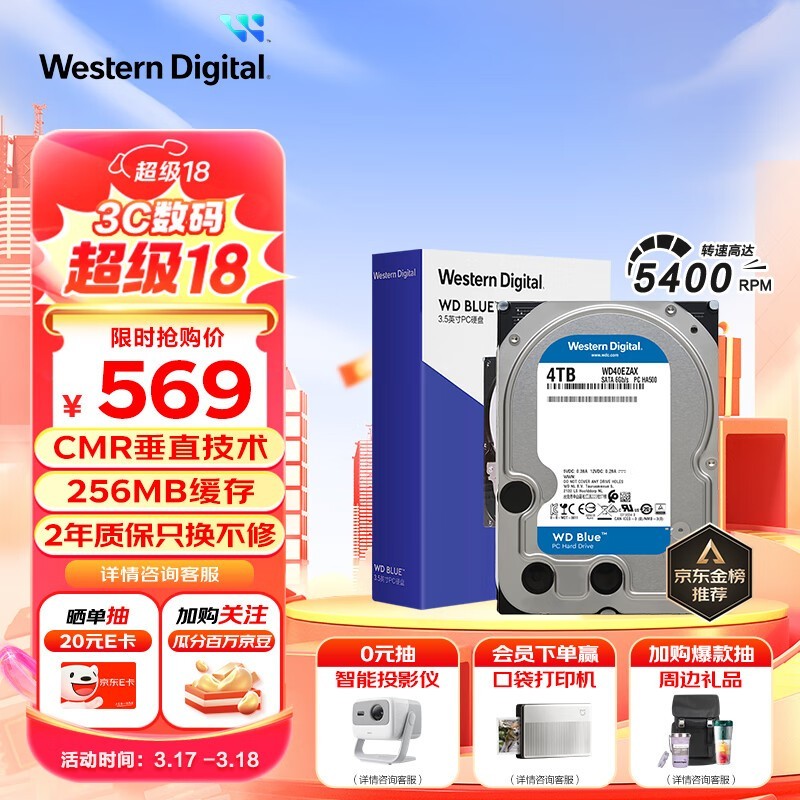 西部数据4TB蓝盘机械硬盘京东热销,559元