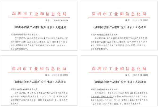 近期,深圳市工业和信息化局正式发布《深圳市创新产品推广应用目录》,康冠旗下四款前沿产品——康冠科技的FPD悬浮OLED电视(65S2)、康冠商用的W82B多模态智能交互白板、皓丽智能的皓丽M7智能会议平板、及康冠医疗的27X4C系列MINILED CT/核磁专用医疗显示器成功入选。