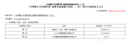 日前,“一汽奔腾公关传播代理-品牌及新能源车标段(二次)”中标结果出炉,哪家厂商成功斩获这项预算超1亿元的大标呢?
