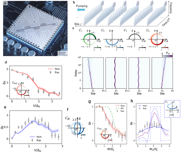 该团队自主设计并制备了“庄子”号一维 43 比特量子芯片,并利用此芯片实现展示了霍夫施塔特蝴蝶能谱。科研人员在“庄子”号上构建了固态量子系统中的 Thouless 泵浦,探讨了 Thouless 泵浦中拓扑与无序的竞争和相互影响,实验观测到准周期相互作用无序诱导的拓扑泵浦。