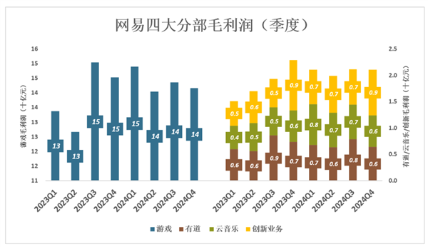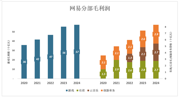 2024年,游戏毛利润增至575亿、毛利润率68.8%;有道毛利润27.5亿、毛利润率48.9%;云音乐毛利润26.8亿、毛利润率33.7%;创新业务毛利润29亿、毛利润率25.8%;