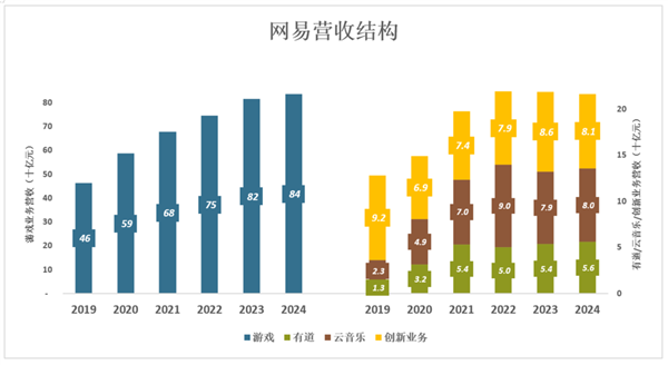2024年,游戏收入836.2亿、占营收的79.4%;有道、云音乐收入分别为56.3亿、79.5亿,合计占营收的12.9%;创新业务收入81亿,占营收的7.7%。
