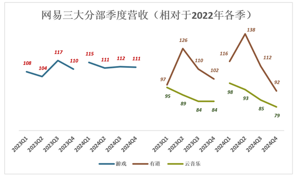 2024年H2,游戏收入增长乏力、有道、云音乐收入同时滑落——Q4游戏营收指数111,有道营收指数92,云音乐营收指数79。