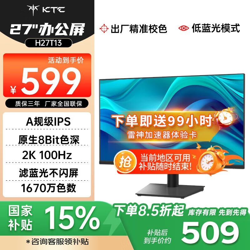 KTC H27T13显示器促销:27英寸IPS屏,到手仅489元