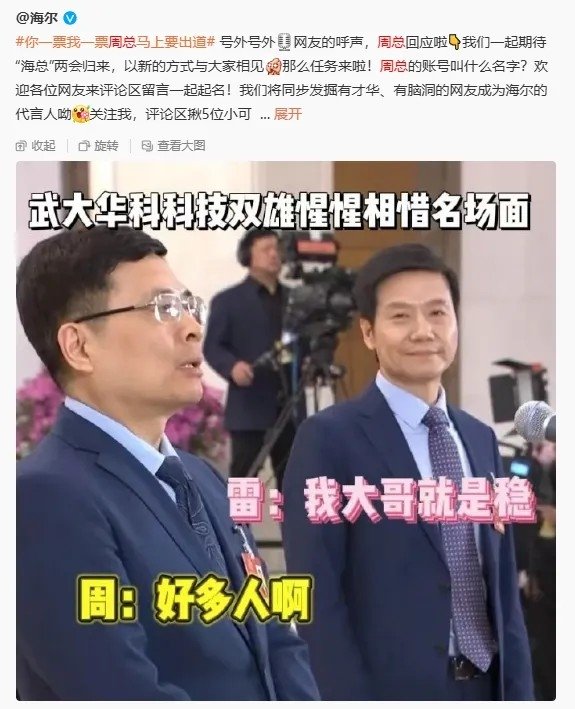在前段时间的全国两会上,只因和先天流量圣体雷军同框,“海尔总”周云杰以一种意想不到的方式意外走红。在画面中,周云杰神情略显“严肃”,以面带笑容的雷军形成了鲜明对比,网友据此造出各种热梗,相关表情包全网刷屏。直到后面海尔官方前来“认领”以及网友们的深挖,大家才知道,原来这位误认为是“雷军助理”的人物,竟然是大名鼎鼎的海尔老总。