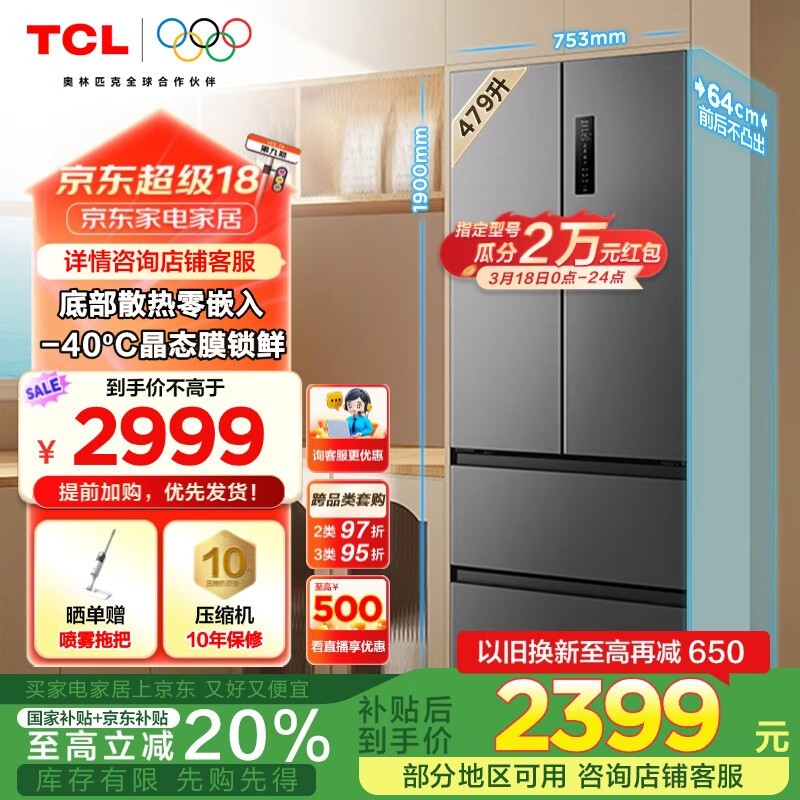 TCL 479升超薄法式四门冰箱:空间大师,净味节能,静享生活新体验(2999元起)