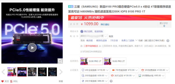 【CNMO科技消息】2月底,三星推出了三星9100 PRO固态硬盘,而在3月18日,该硬盘正式在国内开售,其提供1TB、2TB、4TB和8TB四种容量,其中8TB版本预计将在2025年下半年开售。而1TB、2TB和4TB型号售价分别为1099、1799和3299元。