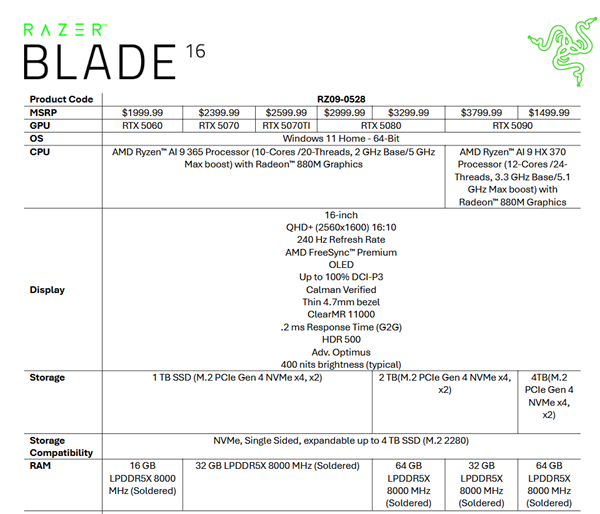 此外,雷蛇Blade 16还将配备16英寸QHD+分辨率的OLED显示屏,支持最高240Hz刷新率,但就价格来看,这款游戏本还是比MSRP贵了将近一倍。