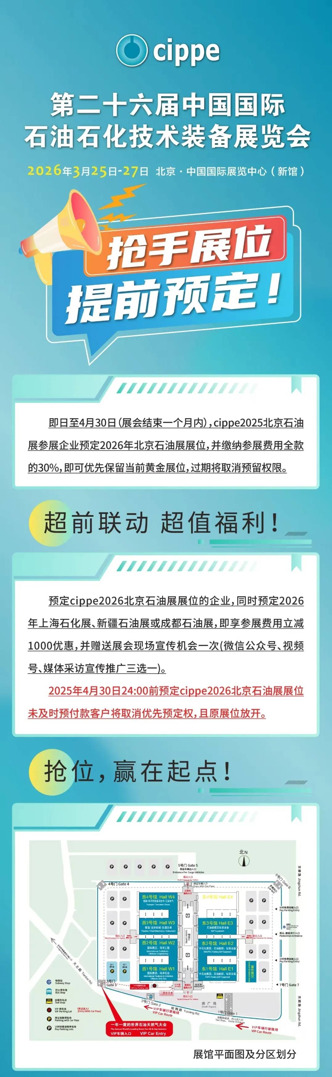 感谢各界鼎力支持,第二十五届中国国际石油石化技术装备展览会(cippe2025)所有展位已全线告罄!应广大企业需求,2026年展位预售通道已震撼开启!作为全球石油石化领域一年一度的重要例会,cippe已连续25年吸引全球能源企业、专业买家共襄盛举,累计促成意向交易近千亿元。