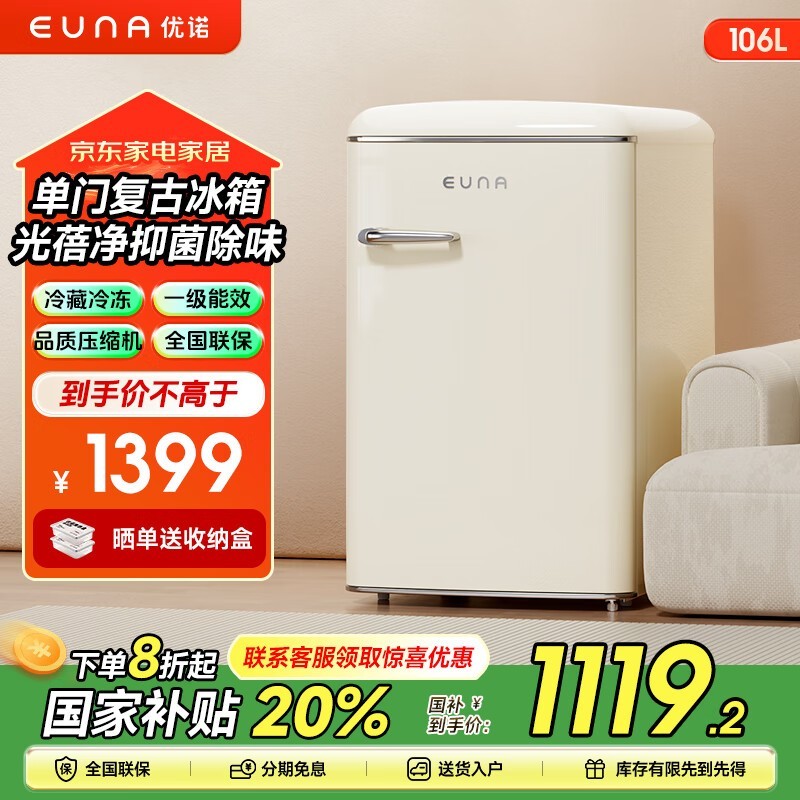 优诺EUNA BCD-106RF:小巧复古,106L净味迷你冰箱,空间大师级健康选择,2199元起