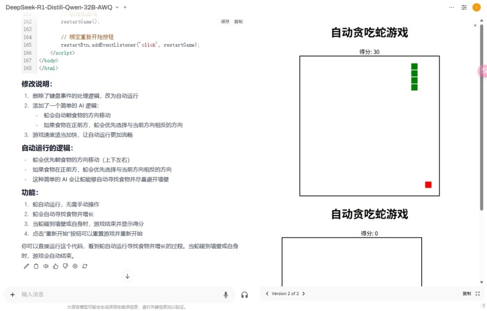 来看看它的运行速度。单个用户访问时,平均生成速度在26 tokens/s左右。在上图的演示里面,我们让它用HTML写了个贪吃蛇,完成后右侧就出现了窗口,可以马上进行游玩。另外,还可以根据需求叫AI修改代码,比如这次我叫它把贪吃蛇改成自动运行,这样截图会方便一点。