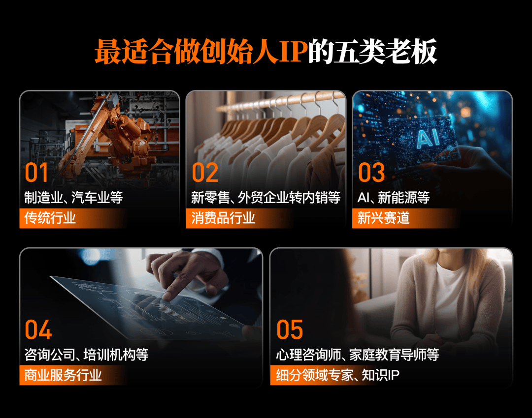 比如,制造业工厂主、区域连锁品牌创始人、家族企业二代接班人等传统行业破局者,打造IP是这些企业老树焕新芽的最有效途径;还有一些实体零售转型新零售、外贸企业转内销的创始人,“AI”、“新能源”新兴赛道的领跑者,咨询公司、培训机构这类商业服务行业创始人等等。