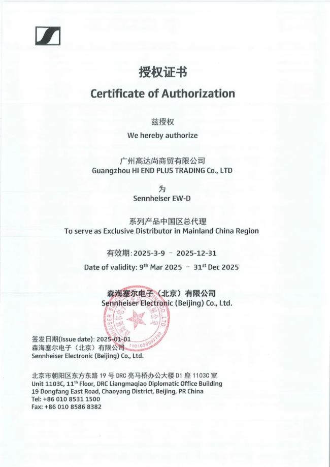 2025年3月9日,广州高达尚商贸有限公司正式成为森海塞尔Evolution Wireless Digital(EW-D)系列在中国区的总代理 。这标志着双方的合作关系进一步深化,为音频市场注入新的活力。