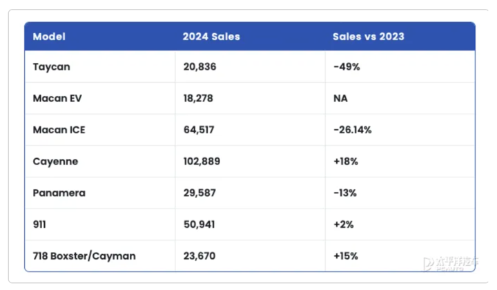 然而,现实却十分残酷。根据保时捷 2025 年 3 月 12 日发布的财报显示,Taycan 车型 2024 年的销量仅为 20,836 辆,同比下降 49%;纯电动 Macan 的表现同样不尽如人意,全年销量仅为 18,278 辆。中国市场的情况更为严峻,所有车型总销量仅为 56,887 辆,同比下降 28%。