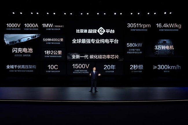 2025年3月17日,比亚迪召开超级e平台技术发布暨汉L、唐L预售发布会,发布划时代超级e平台,推出闪充电池、3万转电机和全新一代车规级碳化硅功率芯片,核心三电全维升级, 实现电动化深度整合,刷新多项全球之最。在充电速度上,实现充电功率1兆瓦(1000kW),实现全球量产最高峰值充电速度1秒2公里,达到全球量产最快充电速度——闪充5分钟,畅行400公里;在性能上,达到单模块单电机功率580kW,最高车速超300km/h,定义全球最强专业纯电平台,首发搭载于划时代旗舰汉L、唐L,即日起正式开启预售,引领电动车下一个时代。