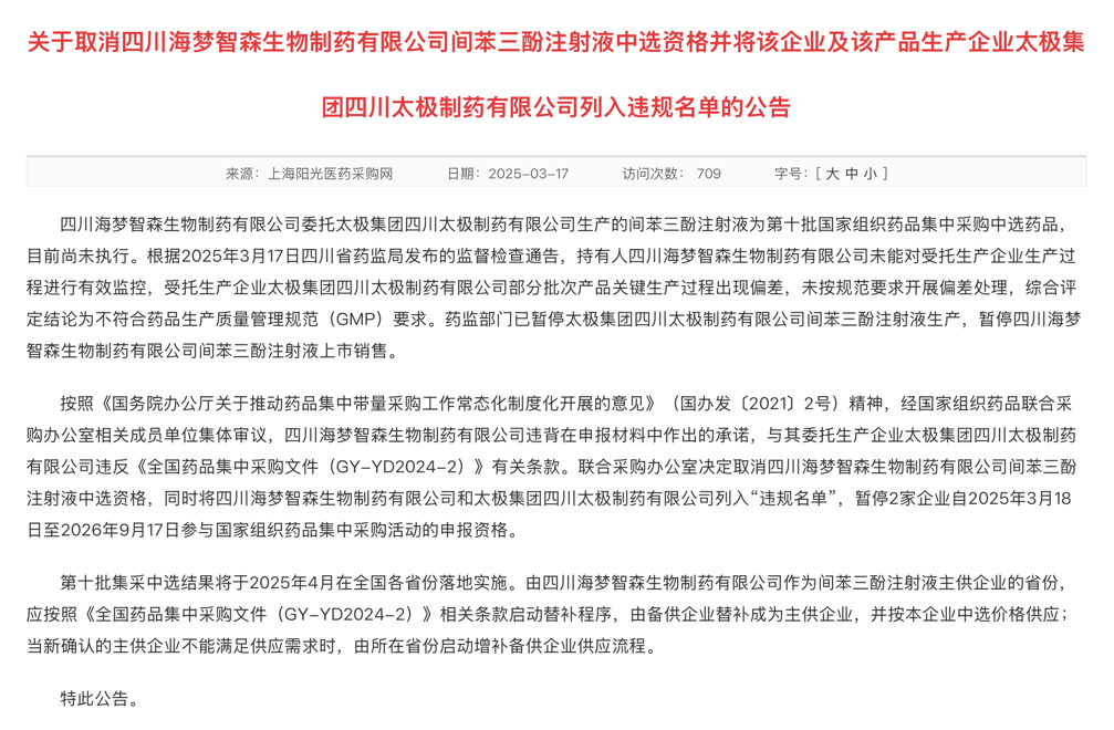 近日,国家医保局官网公示了《关于取消四川海梦智森生物制药有限公司间苯三酚注射液中选资格并将该企业及该产品生产企业太极集团四川太极制药有限公司列入违规名单的公告》。
