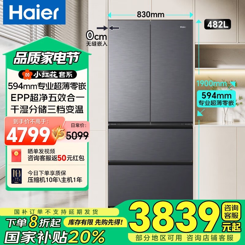 海尔482L风冷法式多门冰箱京东优惠价3709元