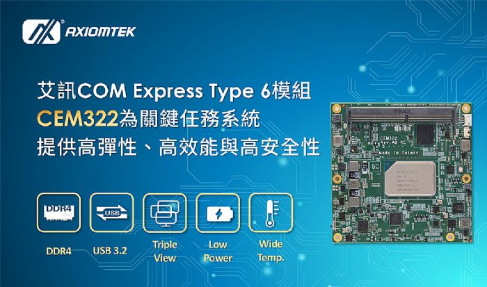 艾讯股份有限公司 (Axiomtek Co., Ltd.) 全新推出工业级COM Express Type 6嵌入式迷你电脑模组CEM322,专为高可靠性而设计,完全相容标准的COM Express载板,实现轻松整合与部署。此外,CEM322 支持艾讯独家AXEAPI 3.0作业系统,可轻松管理硬件监控、看门狗计时器与DIO控制,无论是医疗、工业自动化还是防御行业,都能轻松满足各种复杂的系统需求。