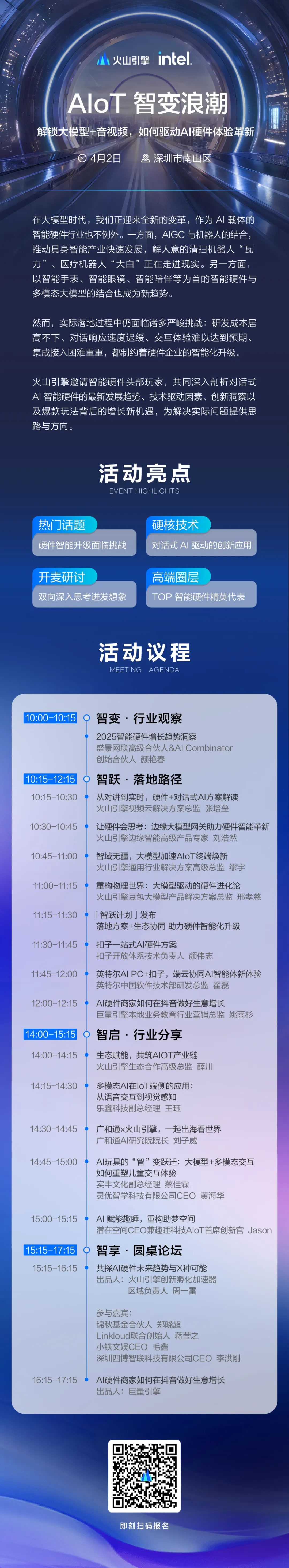 4月2日,火山引擎联合英特尔将在深圳举办AIoT“智变浪潮”技术沙龙。这场活动聚集了芯片厂商、技术方案商、头部品牌方及投资机构,试图从技术融入、体验重构、增长进化三个维度寻找答案。
