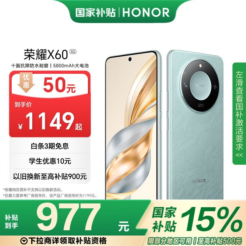 荣耀HONOR X60 8GB+128GB手机京东优惠价925元