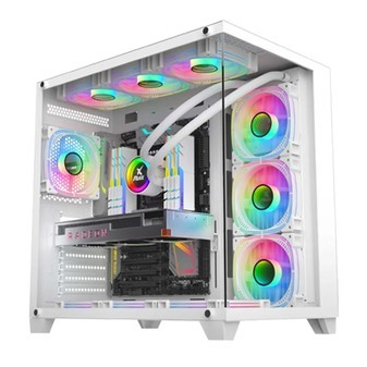 不管是哪种型号的电脑显示屏都与它很搭,尤其当电竞房内的灯光关掉之后,RGB灯光条呈现的炫酷色彩的时候,搭配时尚的机械质感,方正棱角中散发出的炫彩光芒,让人忍不住驻足欣赏。卫战神HZ082这款主机属于中型塔式机箱构造,相比那些传统笨重的机箱,它显得精致而小巧,可以轻松放置在电竞桌上。冷轧钢板材质打造机箱,壁挂式安装硬盘位,机箱上海设计有多个连接口,主机接口除了重启键和LED键以外,还有多个USB接口、音频接口、麦克风接口、耳机接口以及网络接口等,可以多设备一起联动使用,游戏中的我们也能享受音乐带来的动感与轻松。