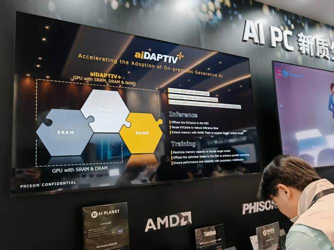 再比如群联电子推出了全新的aiDAPTIV+方案,让GPU通过NAND Flash扩展内存,确保AI训练不受限制。结合AMD显卡组合可为用户提供671B DeepSeek全参数训练推理一体机解决方案,打破显存瓶颈,让AI训练更加高效。此外,aiDAPTIV+ 技术还增强了Inference性能,提供更大的内存支持,不仅能处理更长的Token Length,还能在多人多轮对话时保持与单人对话相同的Time to First Token速度,提高并发能力和用户体验,使AI应用更流畅、更高效。