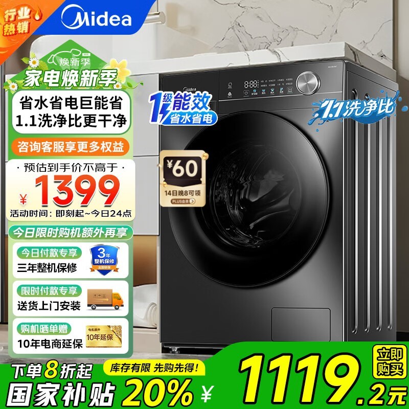美的MG100V36T滚筒洗衣机10kg仅需1119元