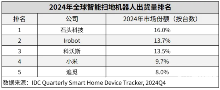 2024年全球智能扫地机器人市场呈现增长态势,石头科技以22.3%的销额市场份额位列第一,这也是石头扫地机器人连续第二年,在全球市场跻身销额第一。