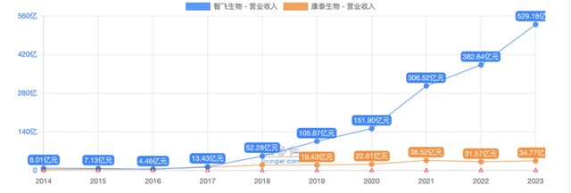 就业绩体量而言,智飞生物是国内疫苗行业当之无愧的绝对一哥,业绩一骑绝尘,和业内其余的玩家完全不是一个数量级的,哪怕入行30多年的老玩家康泰的营收都还够不到智飞利润的一半。