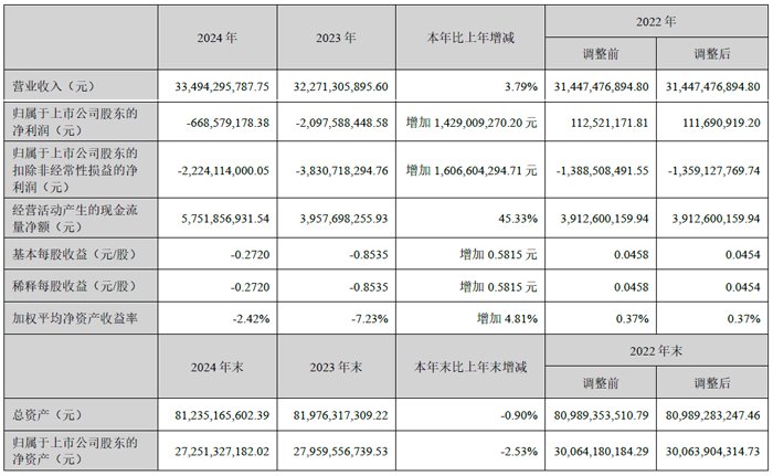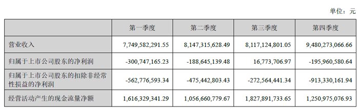 报告期内,深天马实现营收334.9亿元,同比上升3.8%;分季度营收第1至4季度分别为77.50 亿元、81.47亿元、81.17亿元、94.80亿元。归母净利润自去年同期亏损21.0亿元变为亏损6.69亿元,亏损额有所减少;扣非净利润自去年同期亏损38.3亿元变为亏损22.2亿元,亏损额有所减少;经营现金流净额为57.52亿元,同比增长45.3%。截至四季度末,公司总资产812.35亿元,较上年度末下降0.9%;归母净资产为272.51亿元,较上年度末下降2.5%。